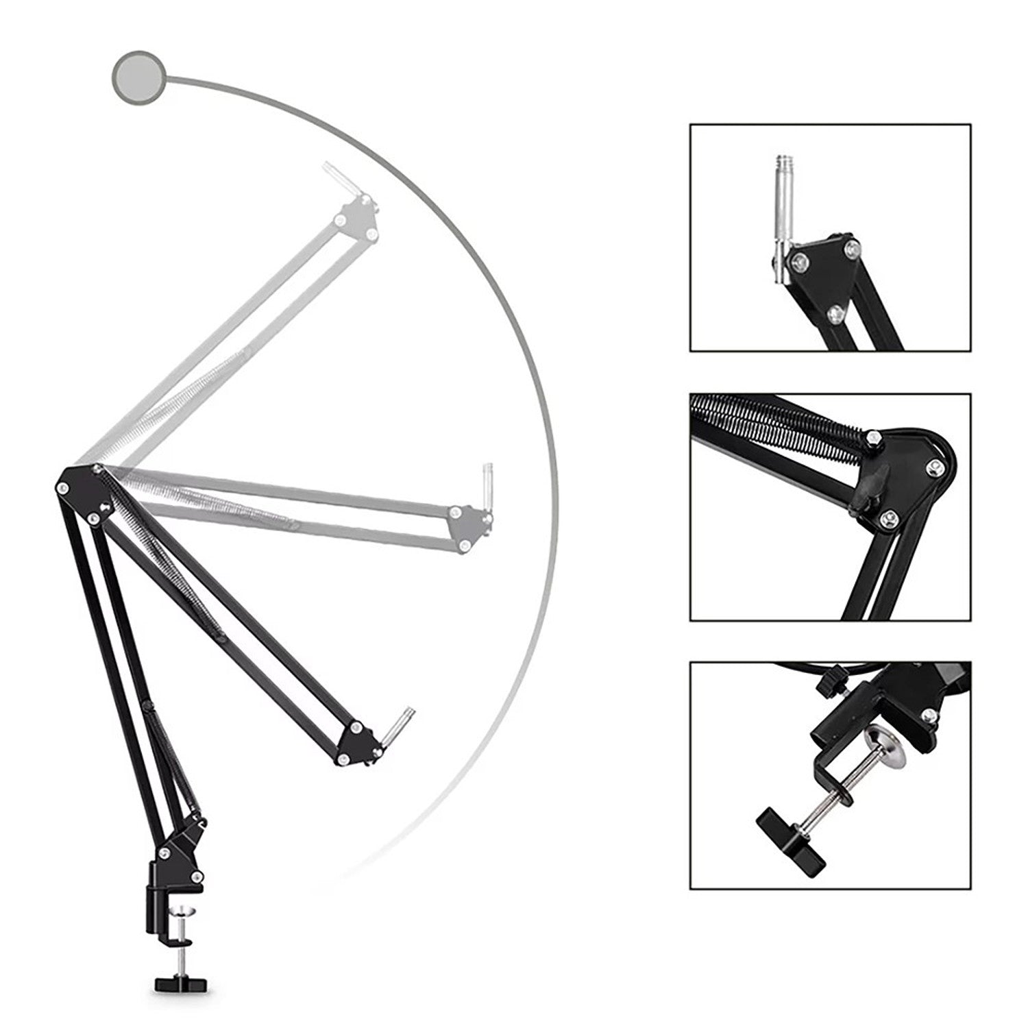 Det justerbara bordsstativet underlättar sömlös mikrofonpositionering och minskar oönskade vibrationer. Dess stålkonstruktion med dubbla justerbara armar säkerställer optimal placering på alla nivåer och kan anpassas till olika mikrofoner.